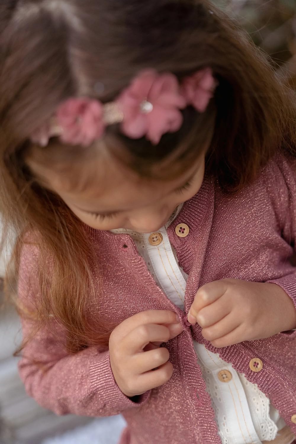 Verleihen Sie der Garderobe Ihrer Kleinen mit dieser festlichen Strickjacke einen Hauch von Glitzer.
