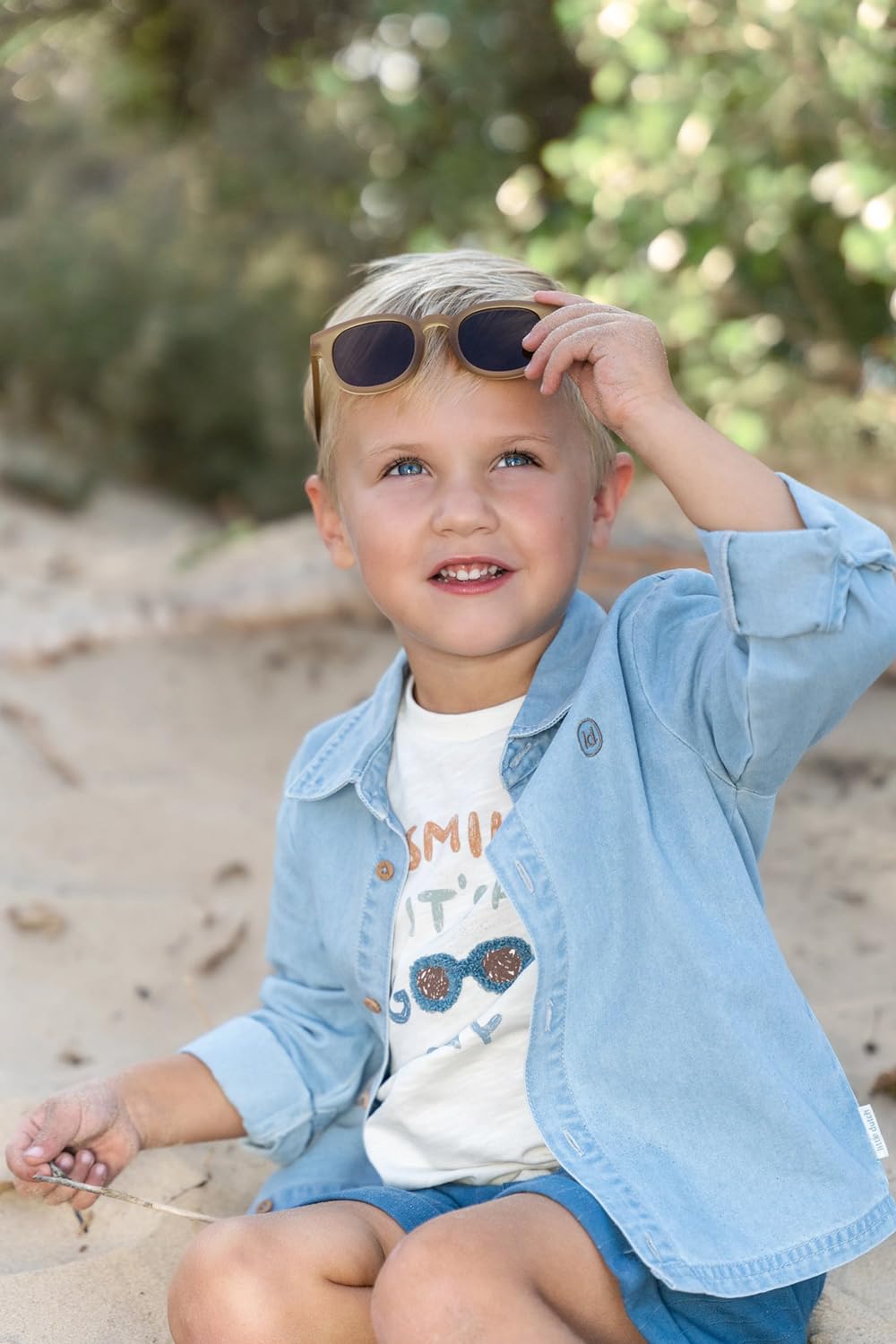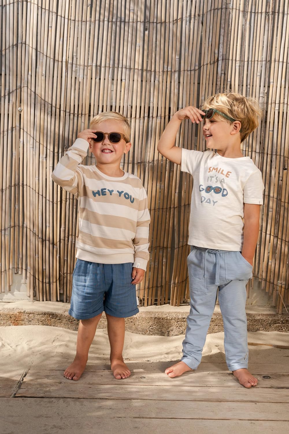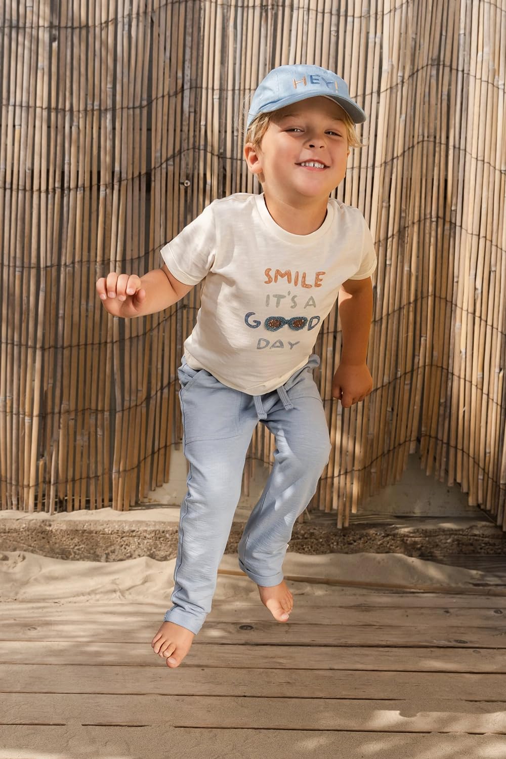 Auf der Brust sorgt ein verspieltes Artwork mit dem Text „Smile, it’s a good day“ und einer kleinen Sonnenbrille für ein sommerliches Extra.