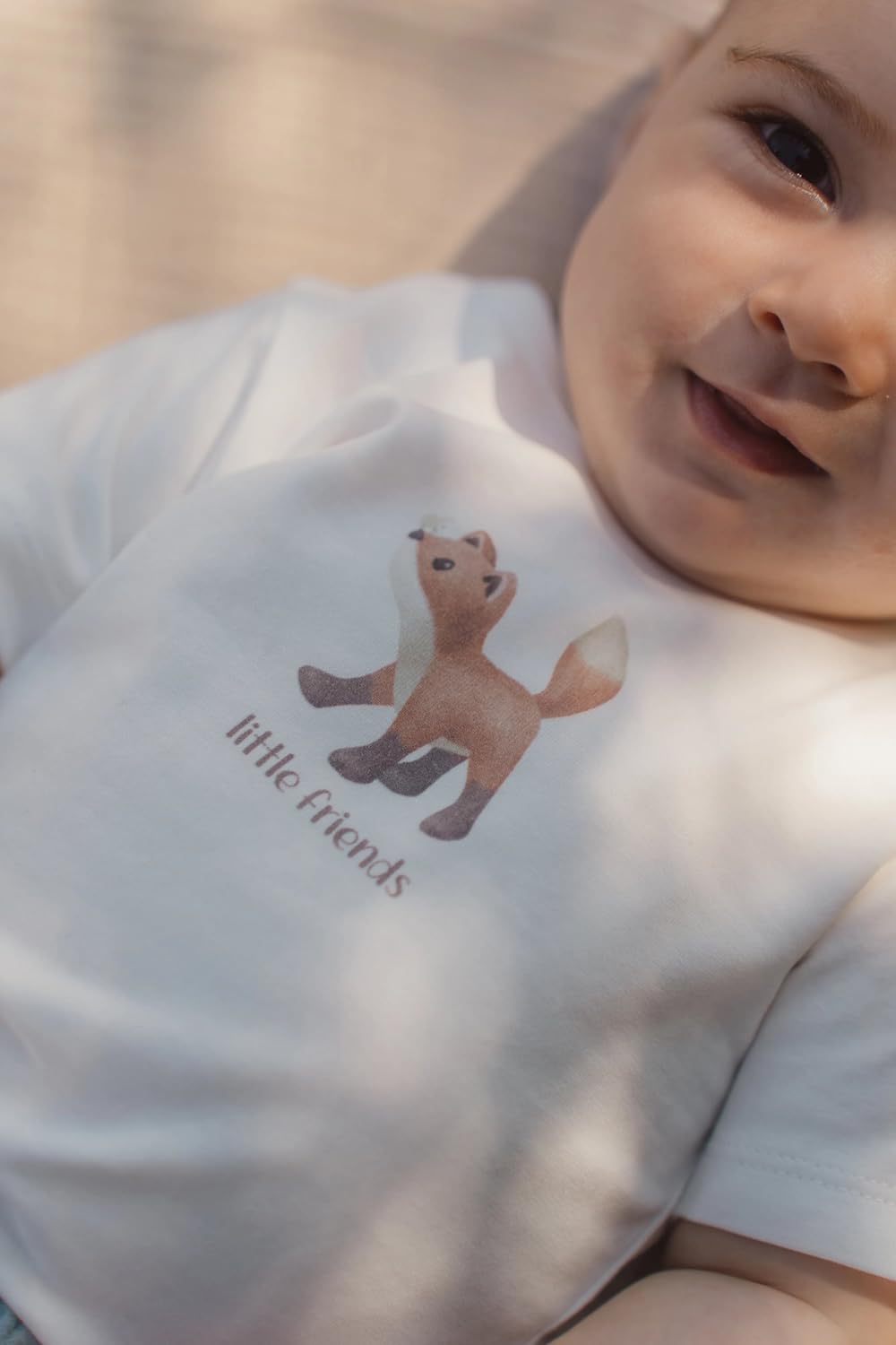 Dieses weiche weiße T-Shirt mit kurzen Ärmeln ist liebevoll mit einem niedlichen Fuchs auf der Brust gestaltet.