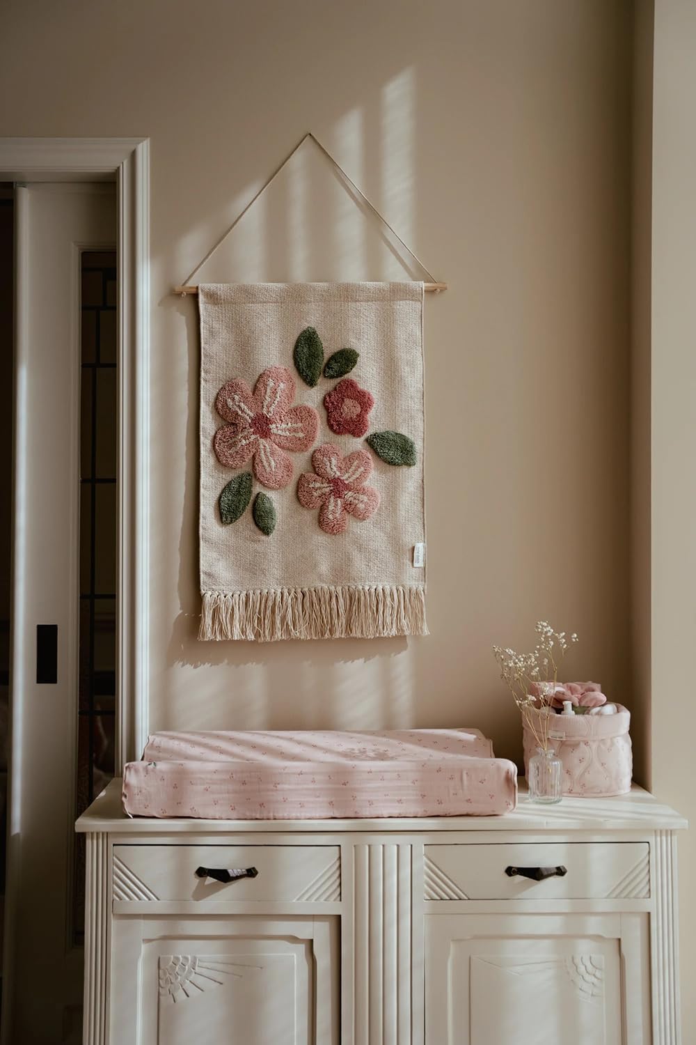 Die fröhlichen Blumen mit weichen Tufting-Details und charmanten Quasten machen das Zimmer besonders gemütlich.