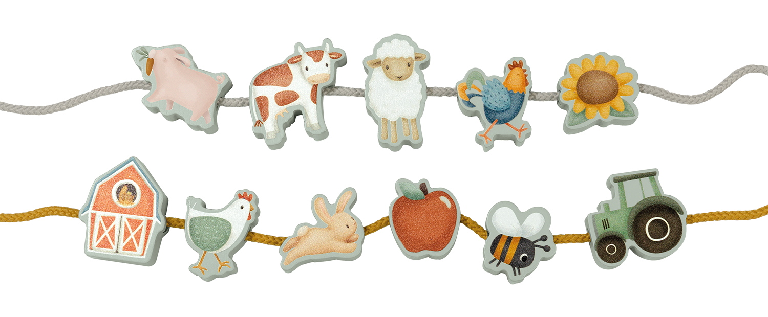 Dieses Perlenset besteht aus einer Spitze und Holzperlen mit den schönen Illustrationen der Little Farm Kollektion.