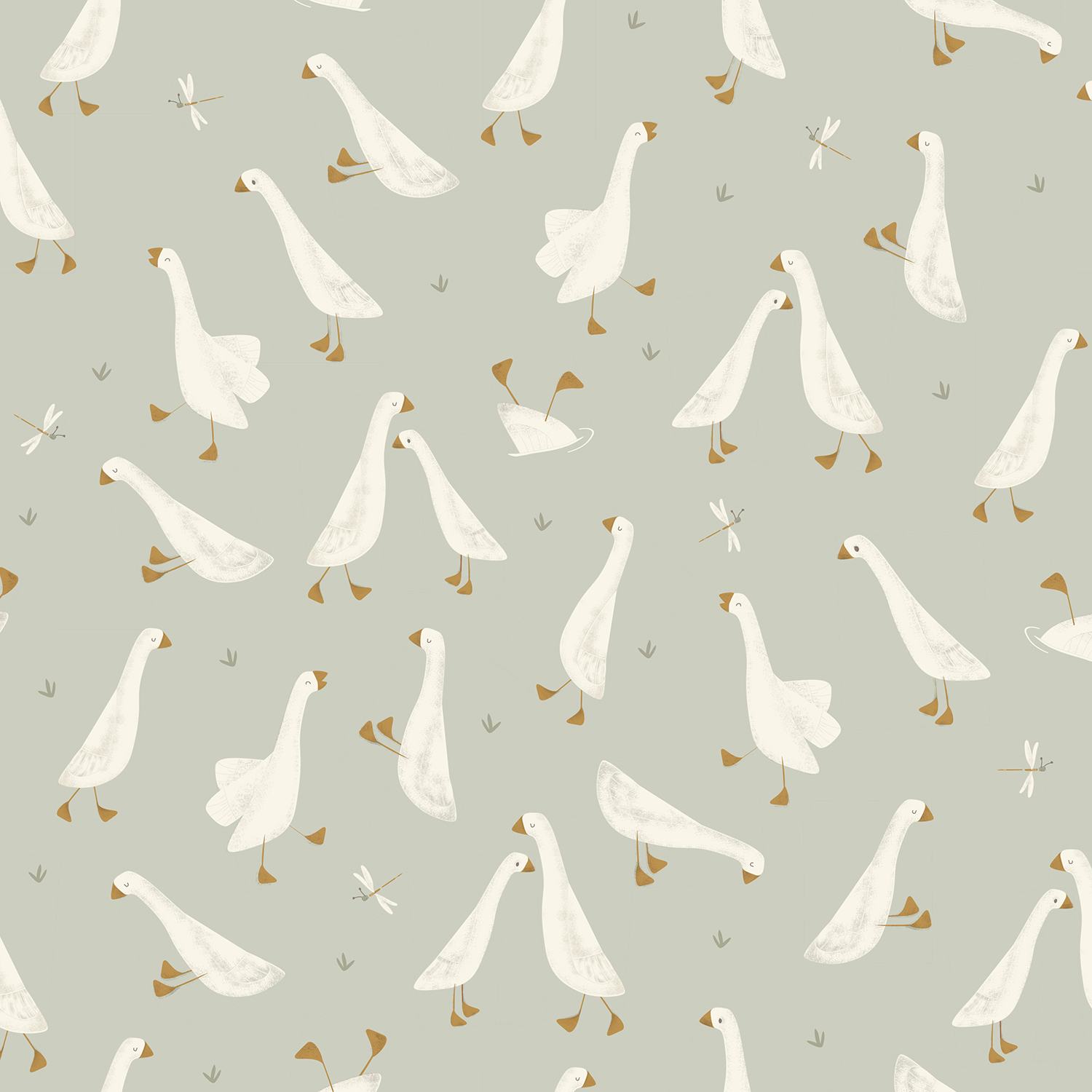 Die Little Goose-Tapete ist in einem weichen Grün erhältlich und lässt sich wunderbar mit den verschiedenen matten und reinen Farben aus der Little Dutch-Kollektion kombinieren.