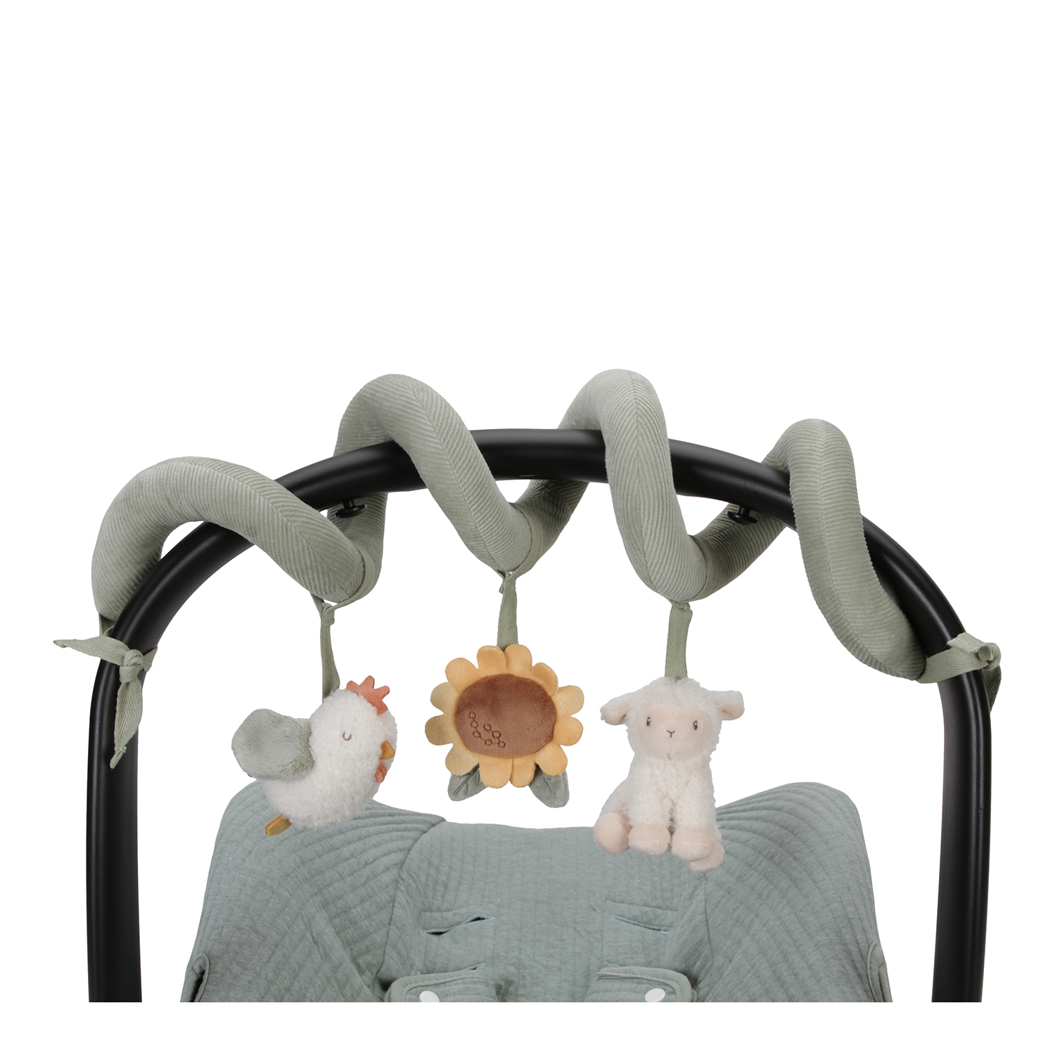 Die Aktivitätsspirale besteht aus Cord mit Baumwolle und dreht sich um ein kleines Schaf, ein fröhliches Huhn und eine schöne Sonnenblume.