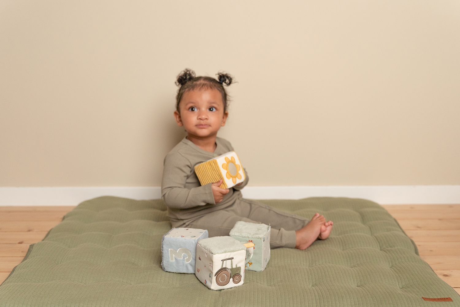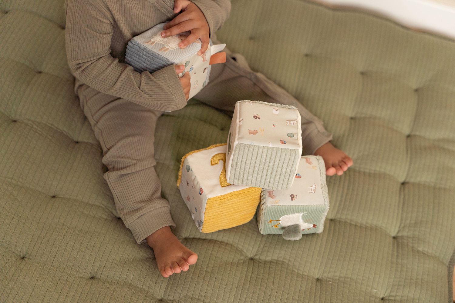 Ring, Ring, Rassel. Mit verschiedenen Geräuschen, Texturen und Farben zum Entdecken wird dieses fröhliche Set weicher Aktivitätsblöcke aus der Little Farm Kollektion dein Kleines stundenlang beschäftigen.