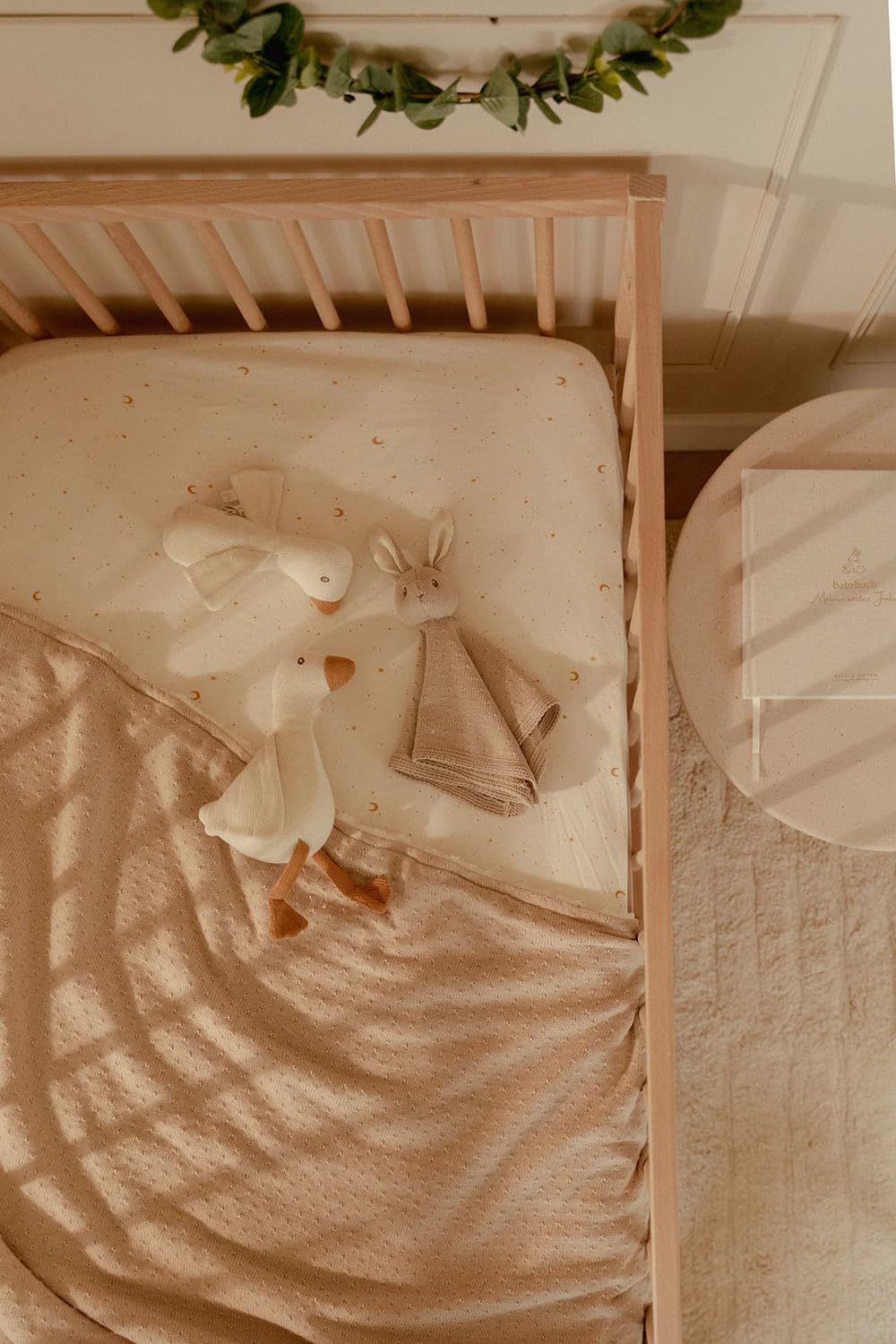 Alles ist aus weichen Materialien in ruhigen, natürlichen Farbtönen gefertigt. Speziell abgestimmt auf die allerersten Monate.