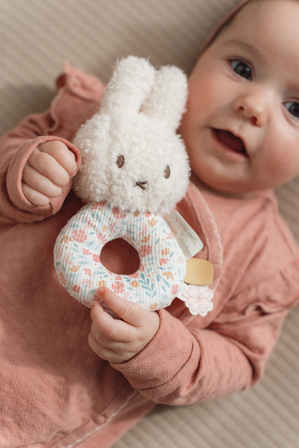 Die ringförmige Rassel ist mit dem Lucky Blossom-Aufdruck von Little Dutch verziert und lässt sich von kleinen Kinderhänden leicht greifen.