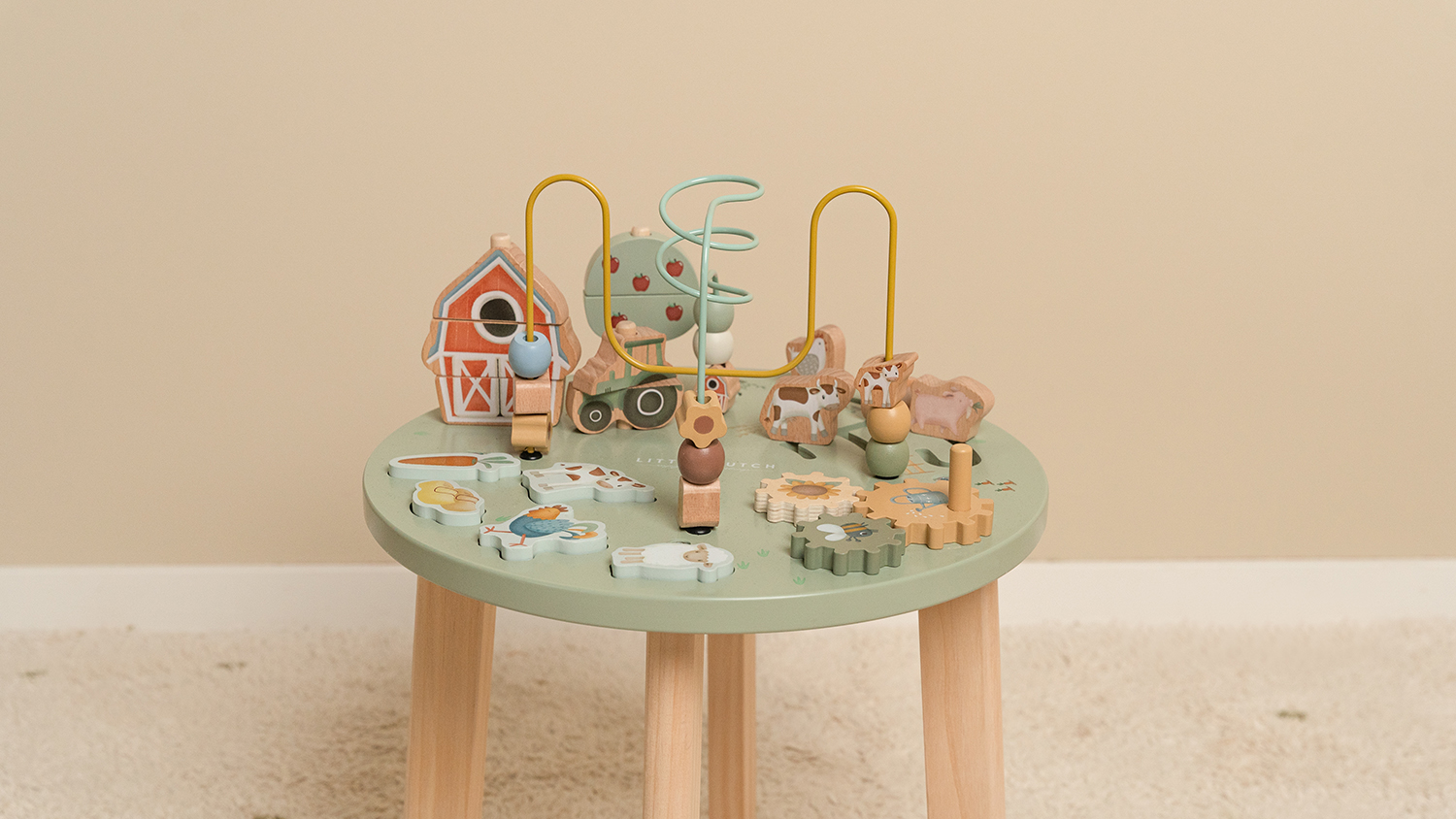 Dieser hölzerne Aktivitätentisch fordert Ihr Kleinkind auf vielfältige Weise heraus.