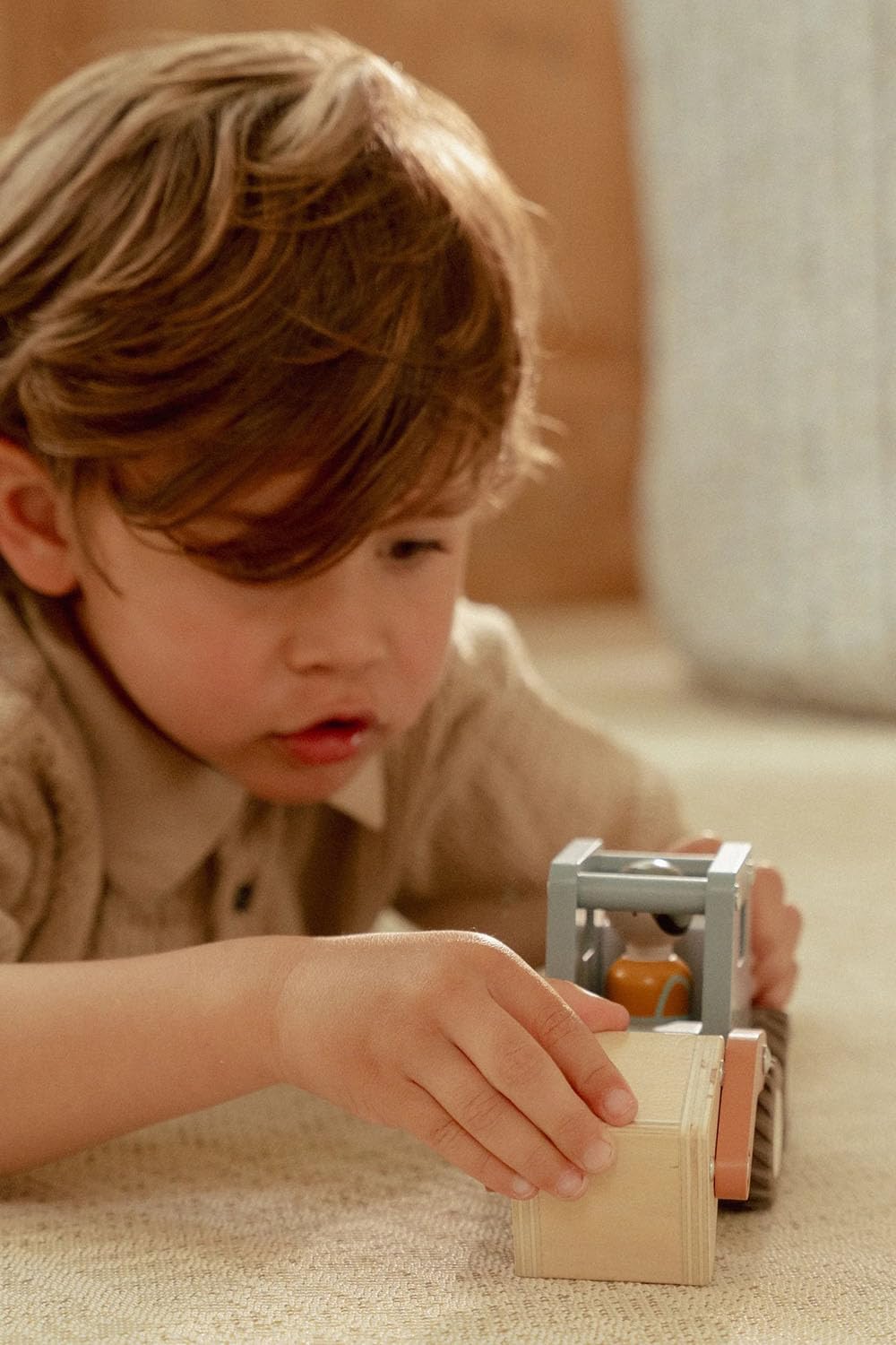 Der Holzkrahnwagen hat einen drehbaren Arm und wird mit einem Bauarbeiter geliefert.