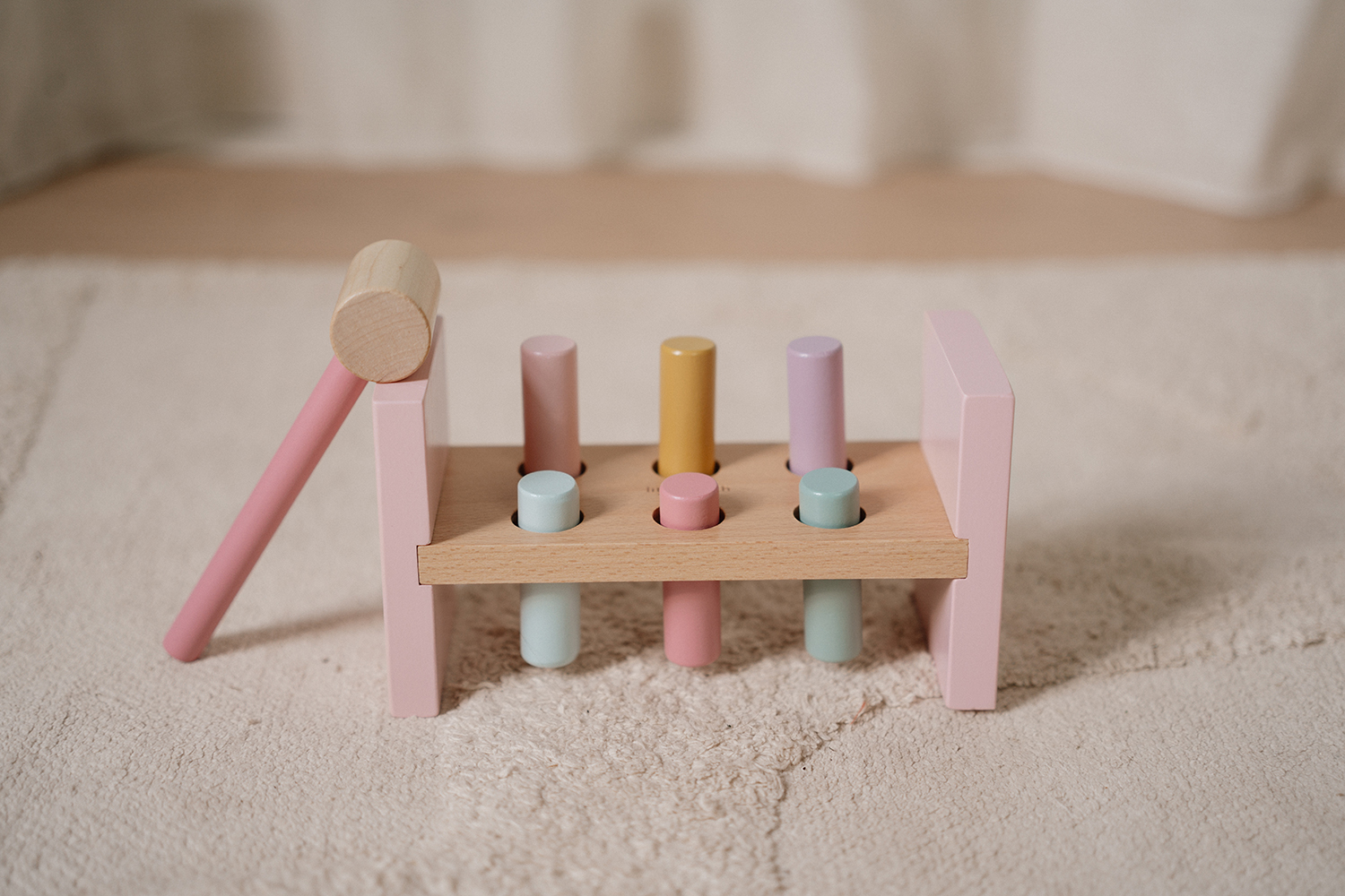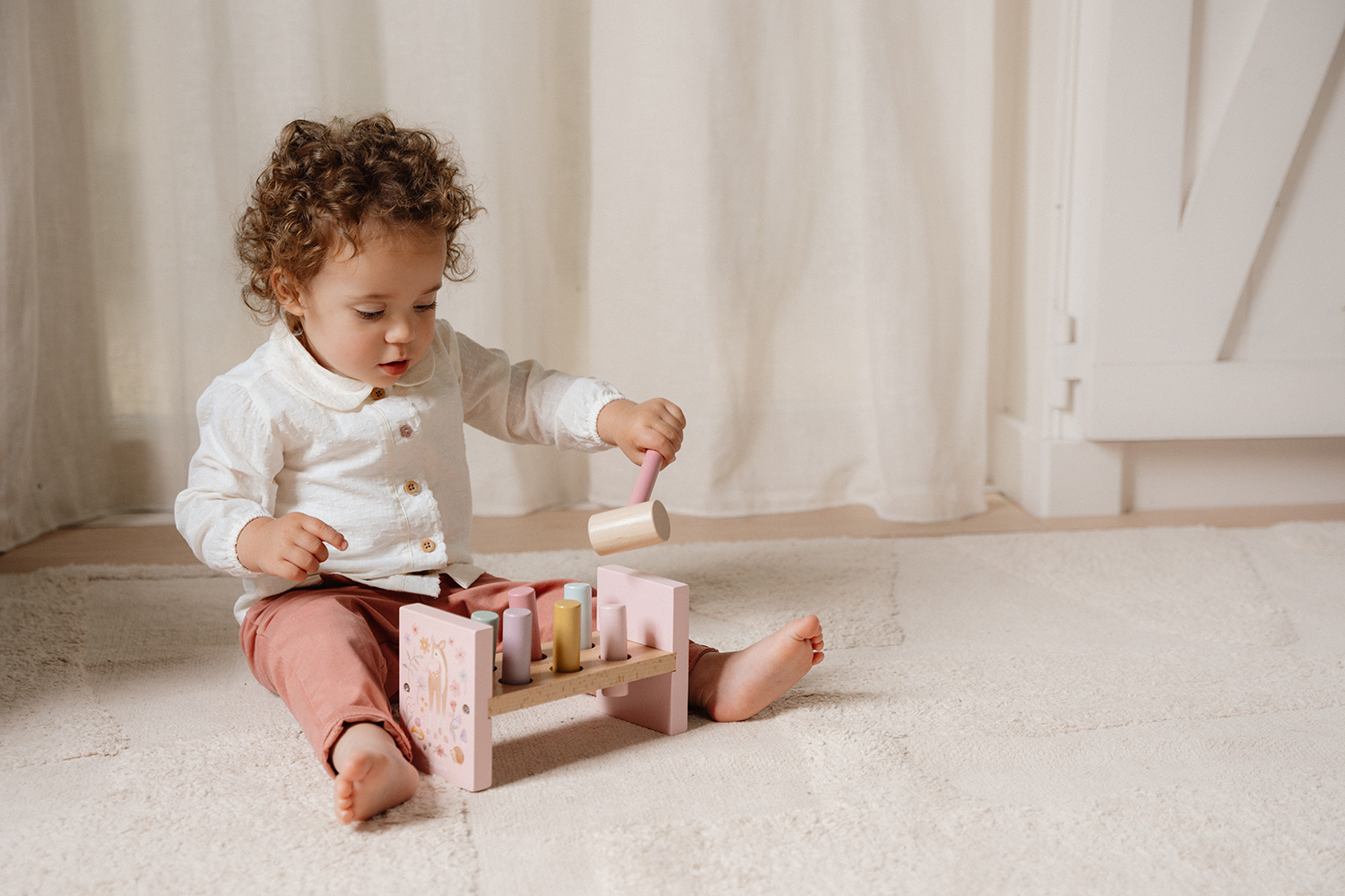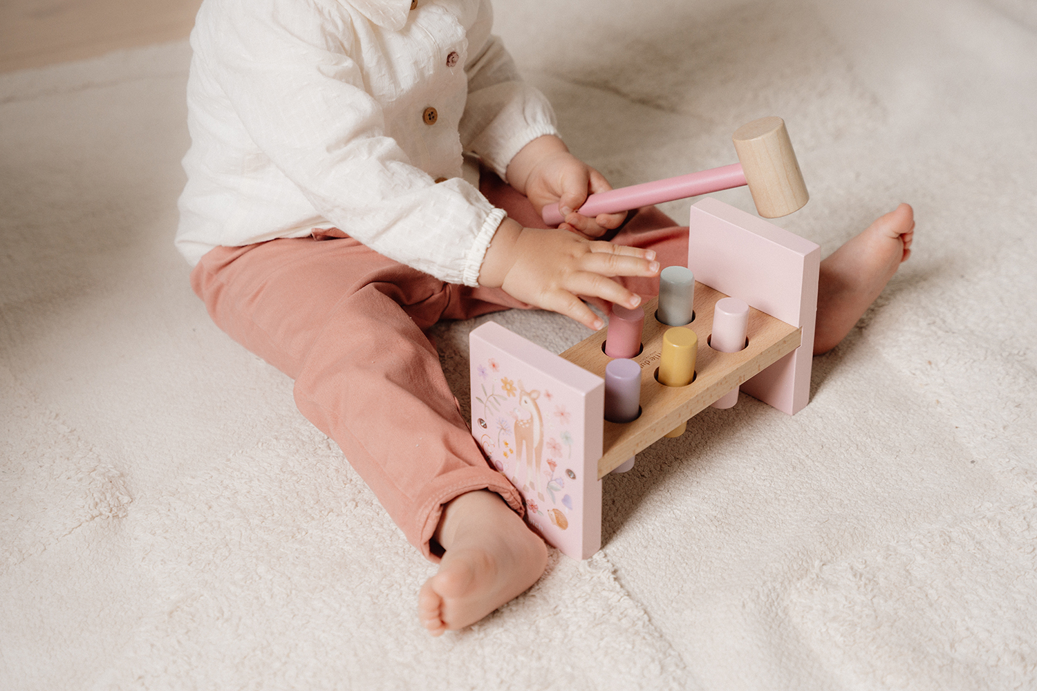 Tap Tap Tap! Klopfe mit dem Hammer die 6 farbigen Pflöcke in die hölzerne Klopfbank und entdecke den Zauber von Fairy Garden.