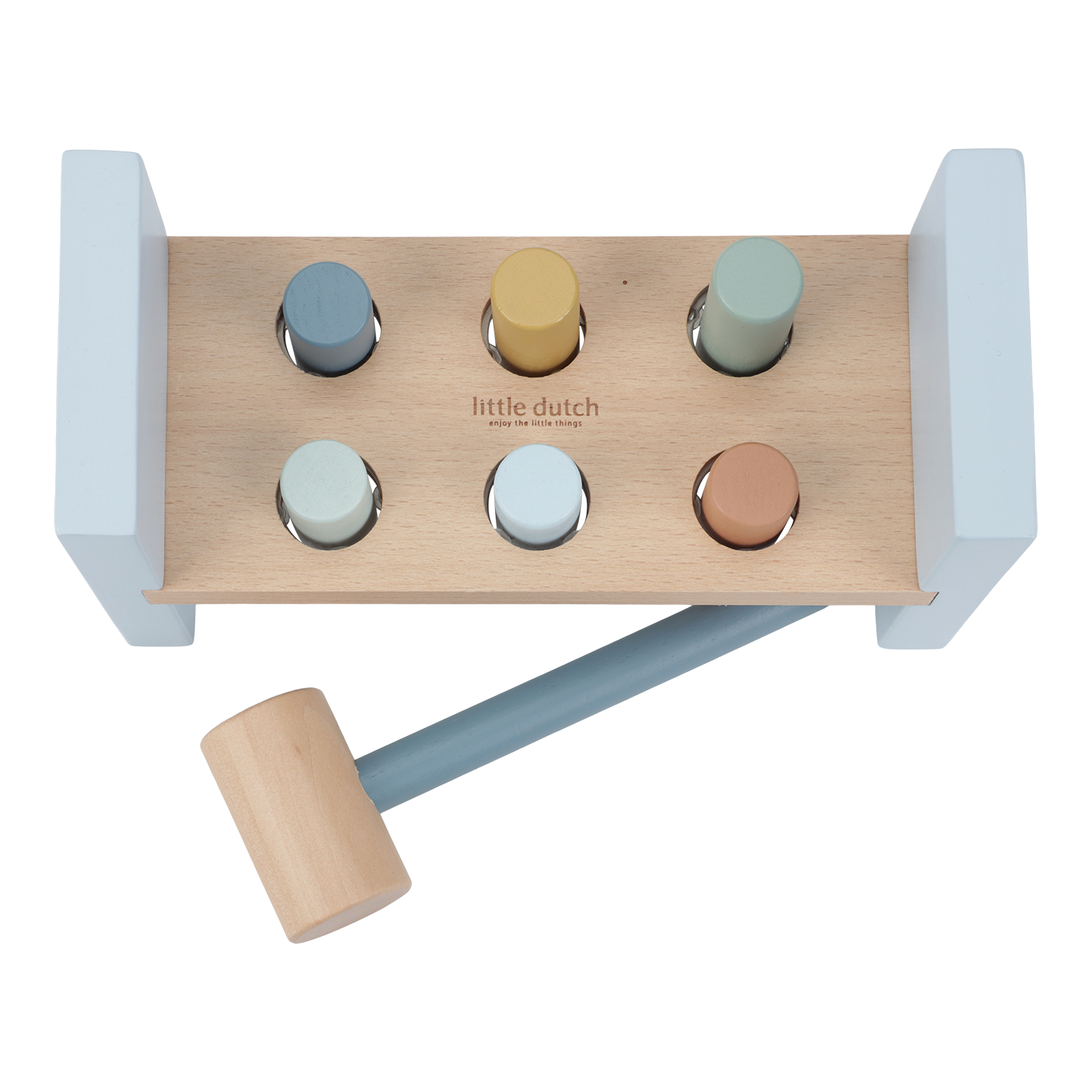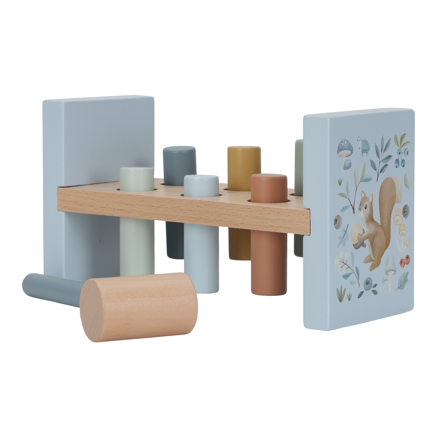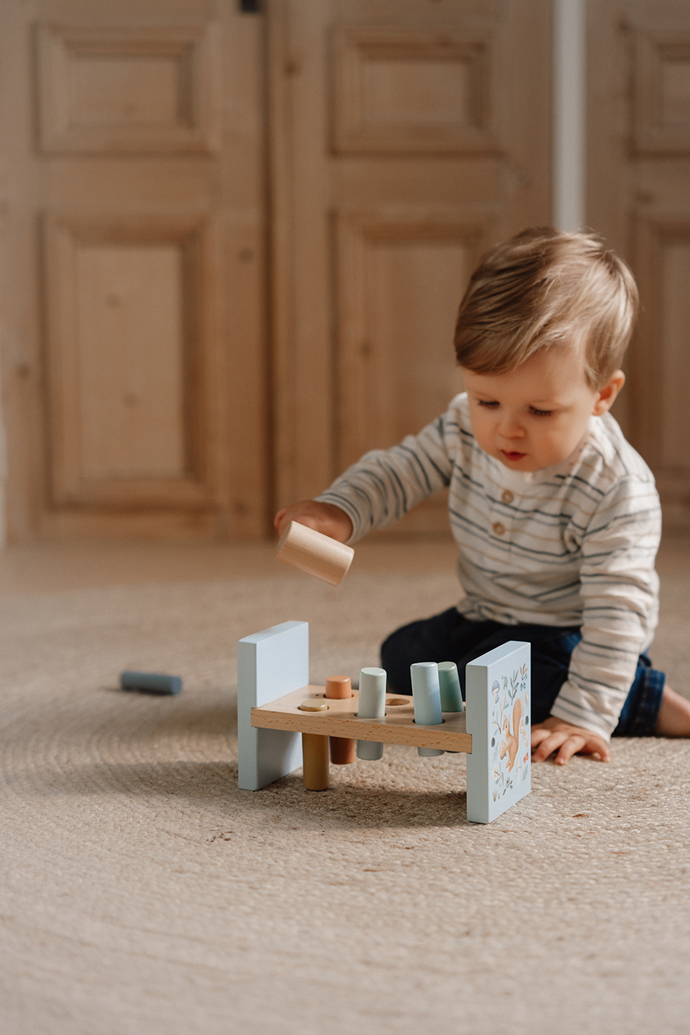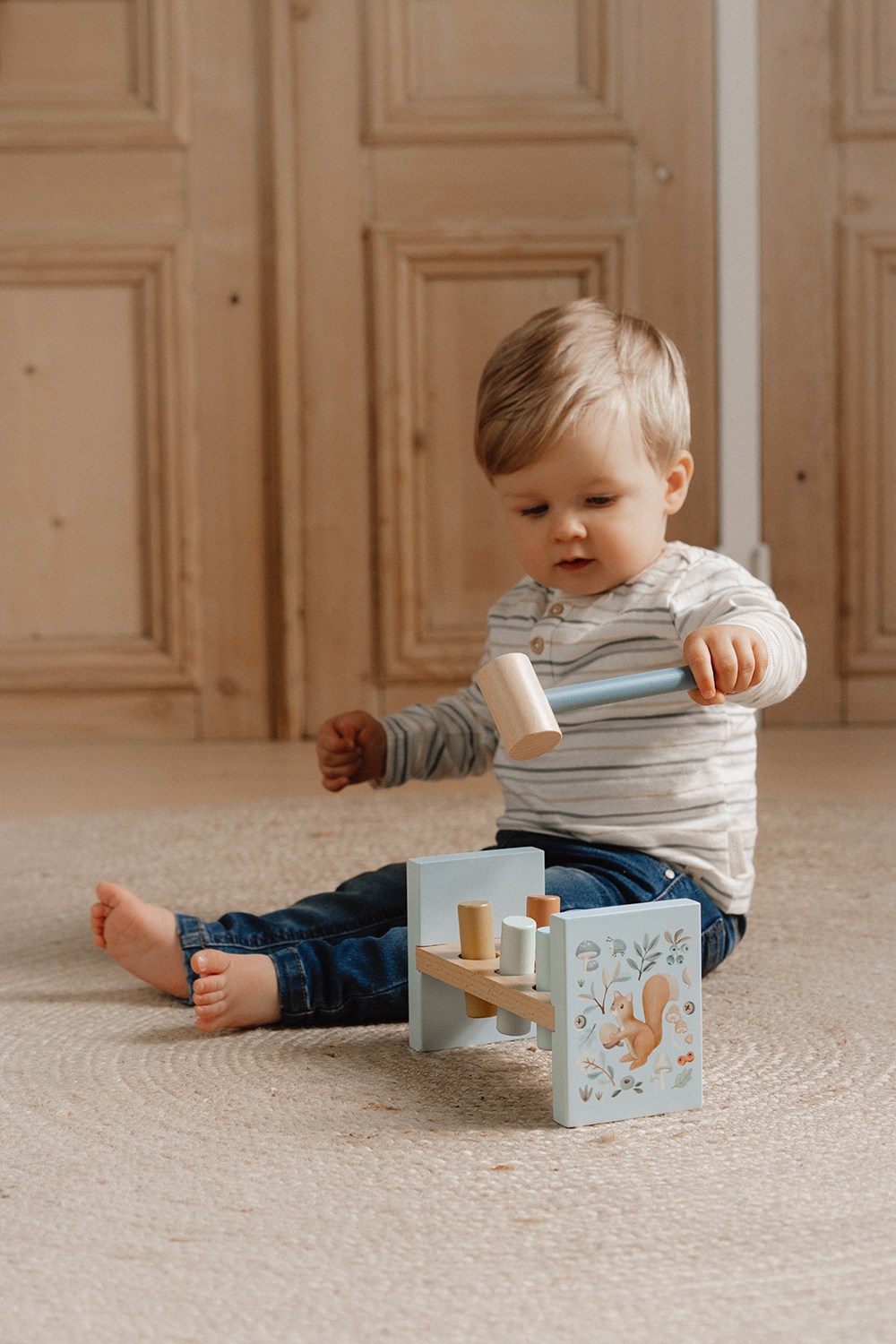 Tap Tap Tap! Klopfe mit dem Hammer die 6 farbigen Pflöcke in die hölzerne Klopfbank und entdecke die Magie von Forest Friends.