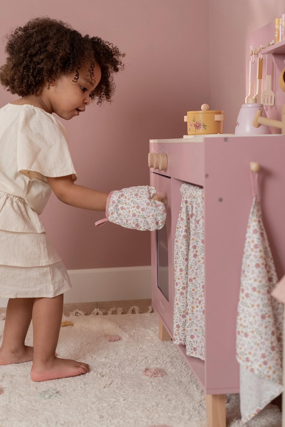 Der Stoffvorhang, das Geschirrtuch und der Ofenhandschuh sind mit dem sanften Soft Flowers-Muster verziert.