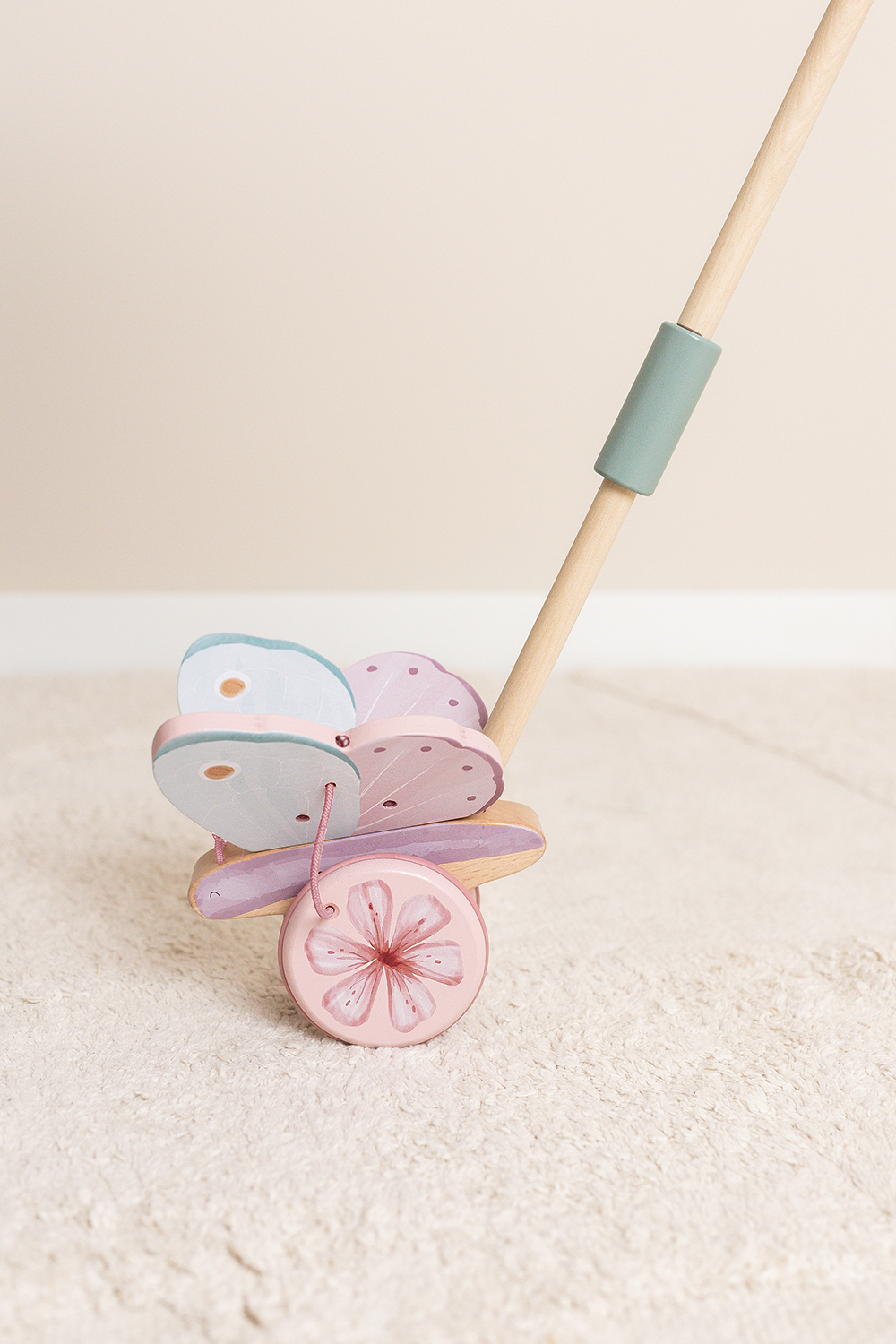 Es ist aus strapazierfähigem Holz gefertigt und hat Gummiräder für endlose Spielstunden.