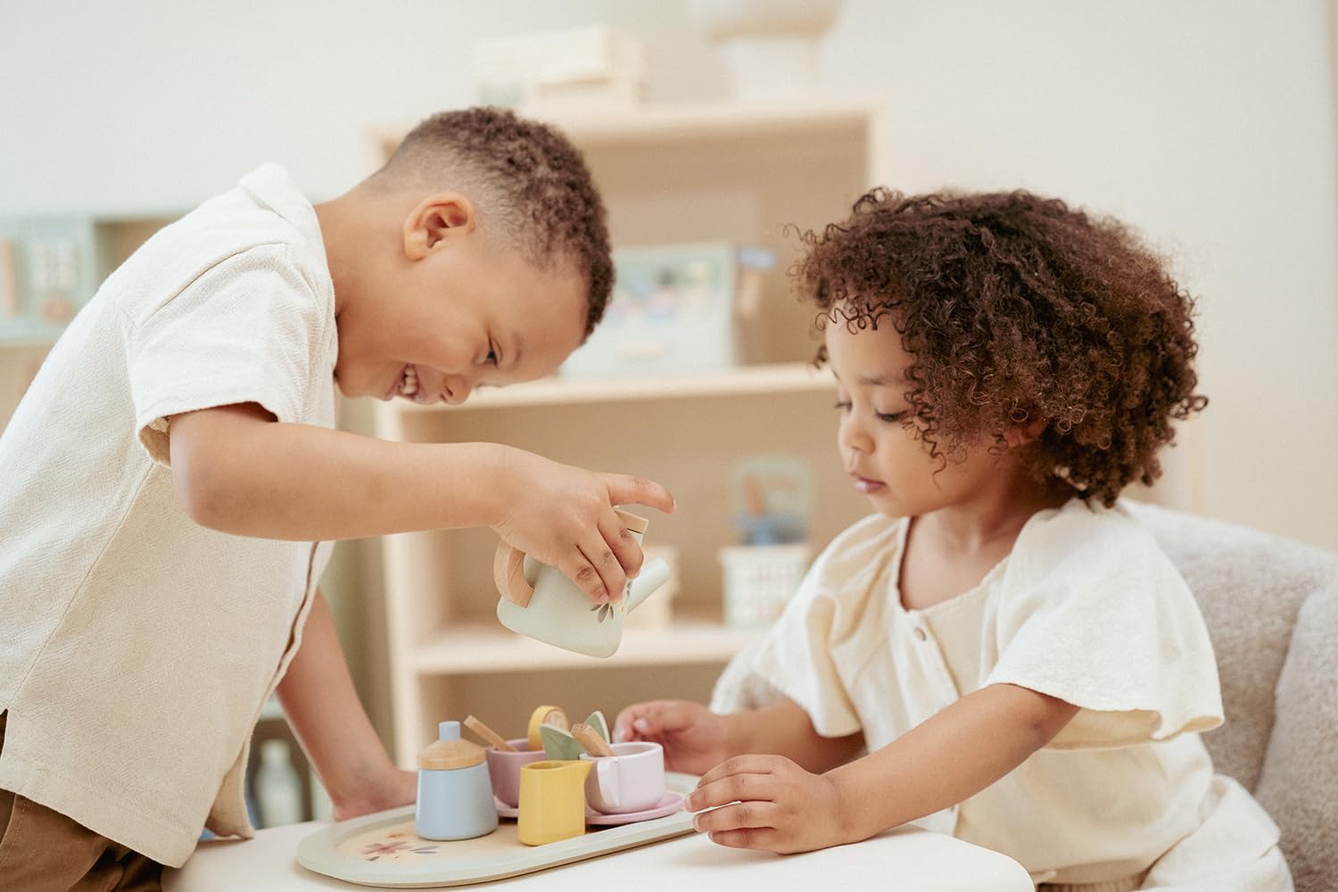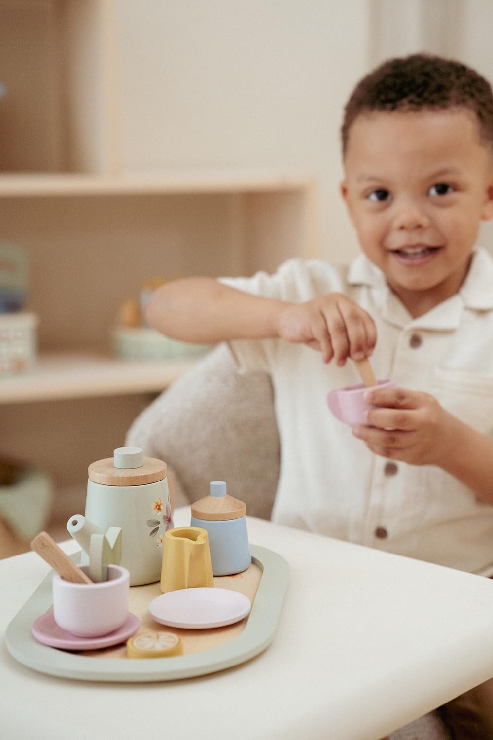 Mit diesem wunderschönen hölzernen Teeservice kann dein Kind köstliche Tassen Tee einschenken.