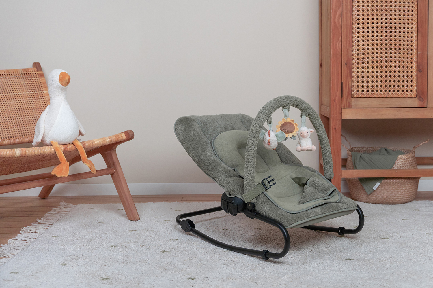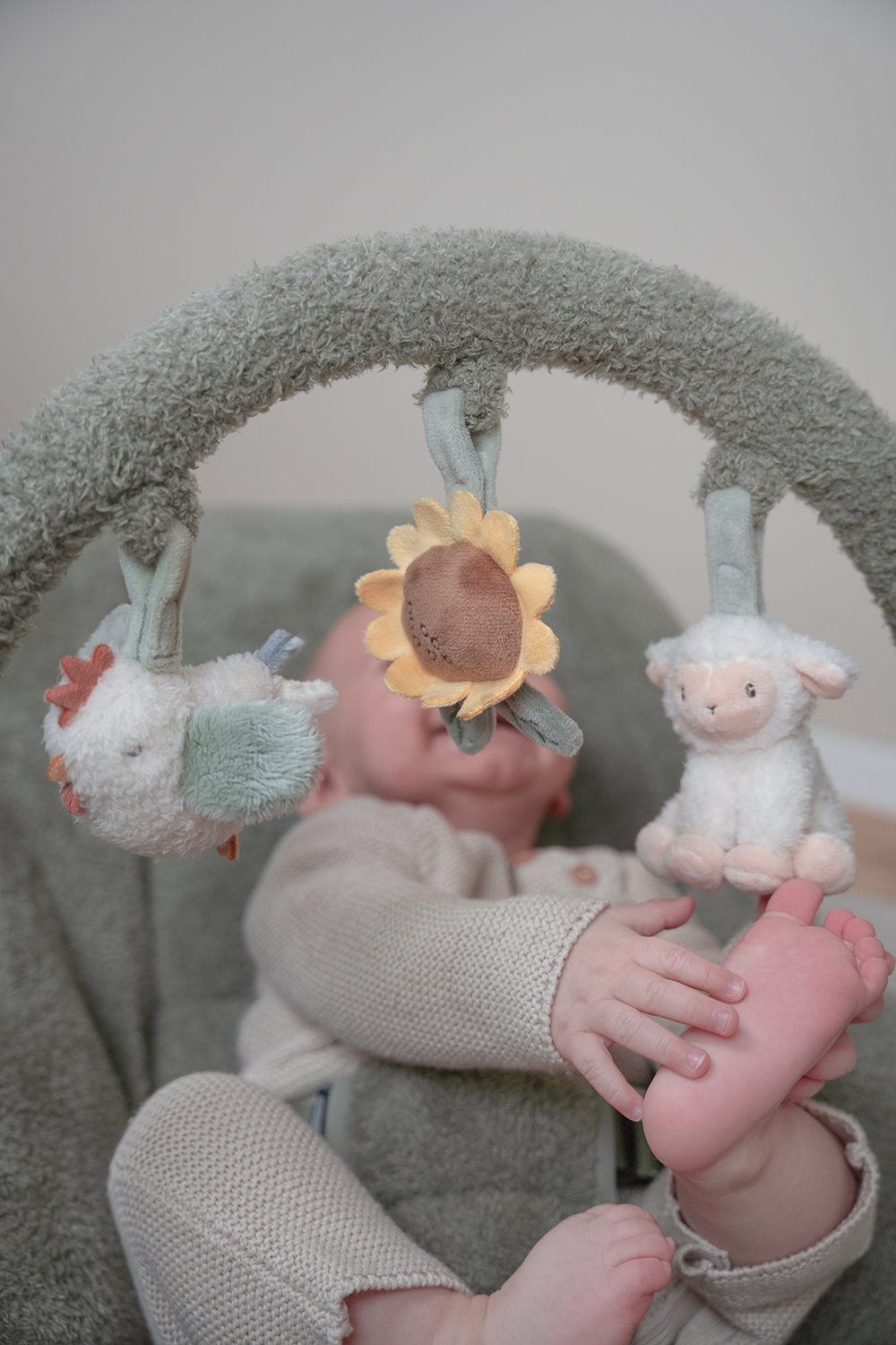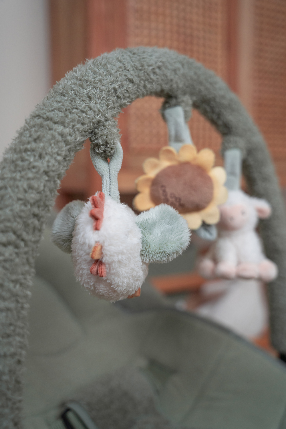 Der Stuhl wird mit einem Verkleinerungskissen und einem verstellbaren Spielbogen geliefert. An dem Spielbogen sind eine Sonnenblume, ein Huhn und ein Schaf befestigt.