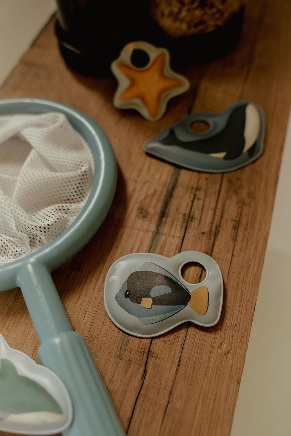 Das Set enthält eine Angelrute, ein Kescher und acht bunte Meerestiere.