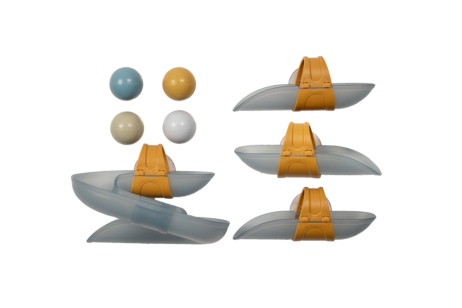 Platzieren Sie die Kugelbahn an der Badezimmerwand und lassen Sie ihr Kind den Ball hinunterrollen, um ein spritziges Badevergnügen zu erleben.