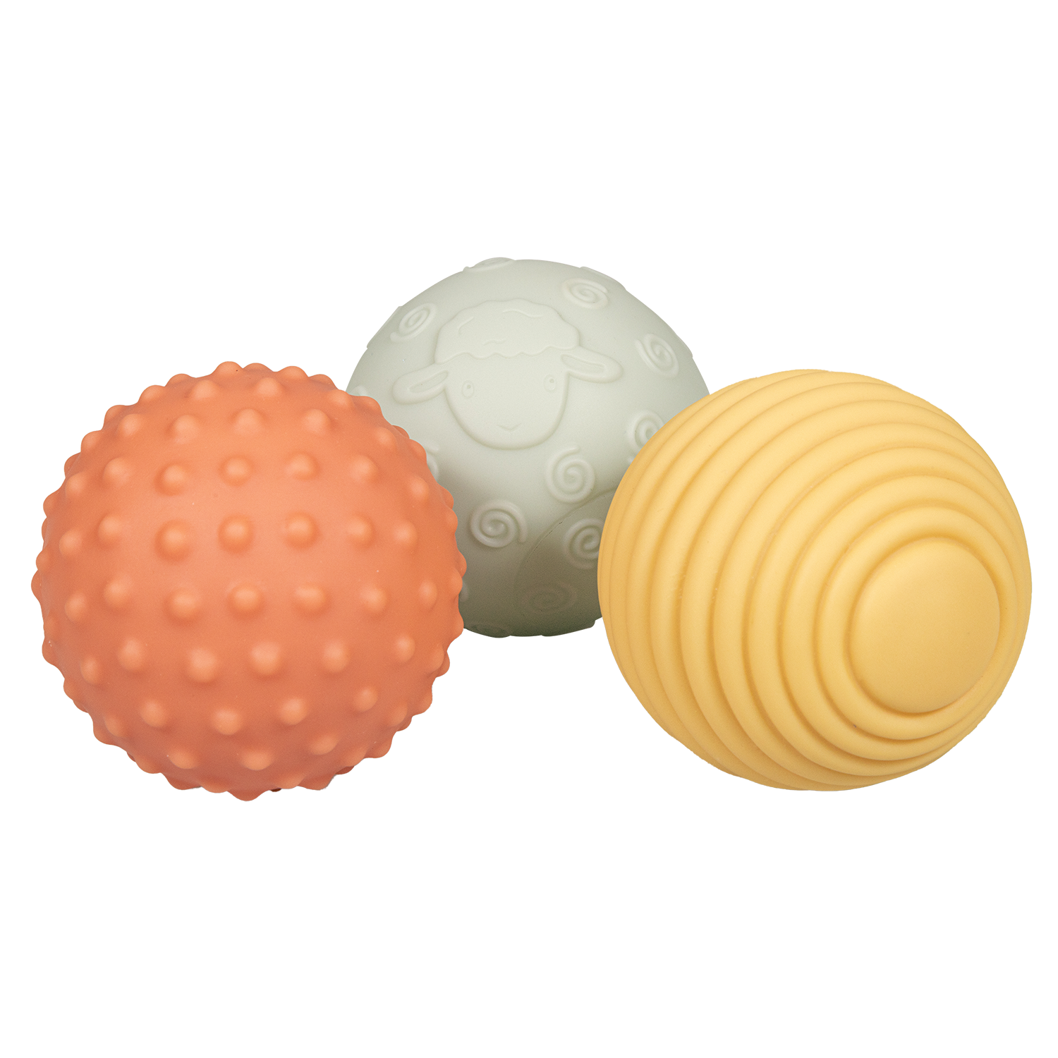 Das Set besteht aus 3 Bällen, jeder mit seiner eigenen Farbe und Textur. Die Größe der Bälle beträgt 6,5 cm.