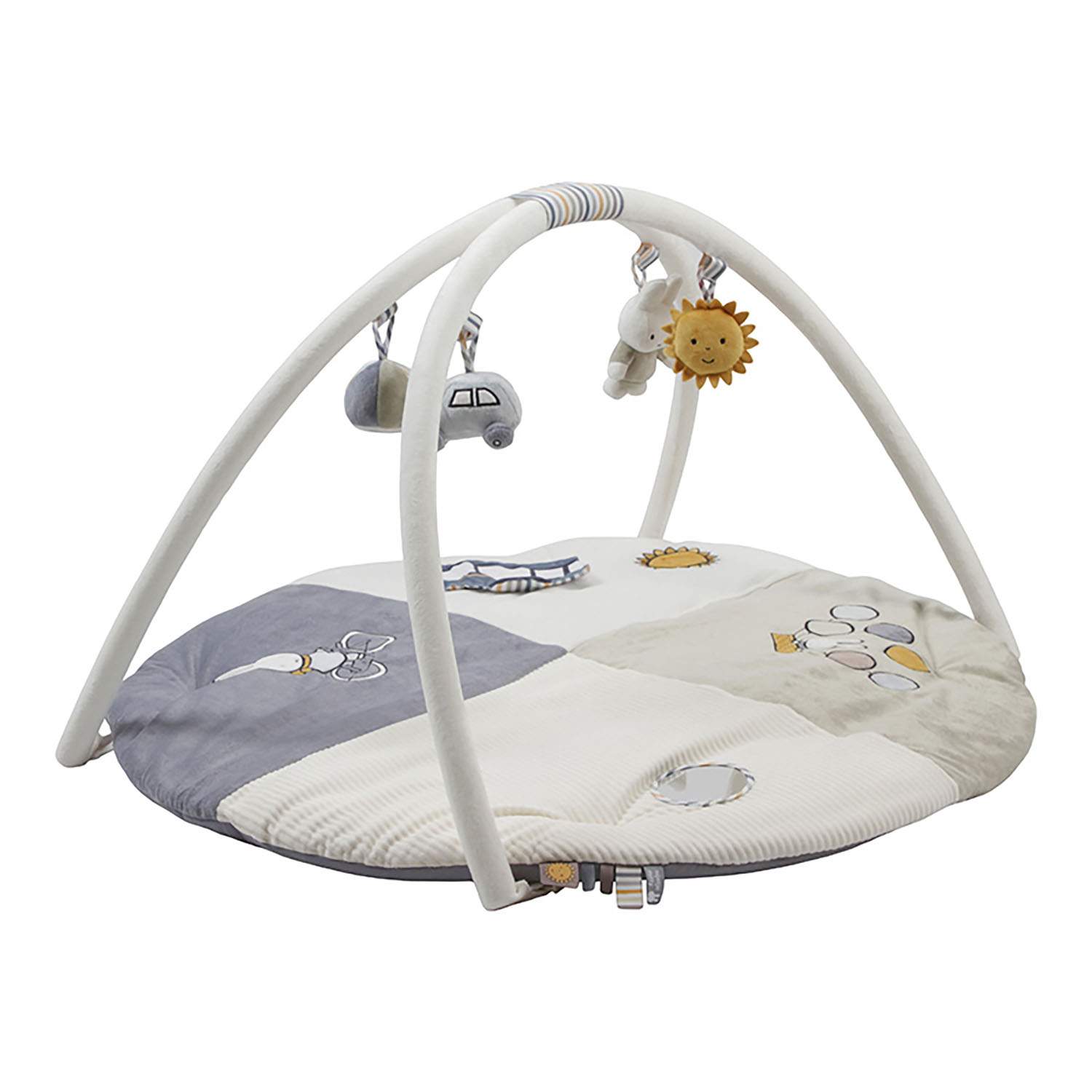 Die Matte enthält hängendes Spielzeug, einen Spiegel hinter einer Klappe, Knisterpapier, Etiketten zum Fühlen und verschiedene Stoffe.