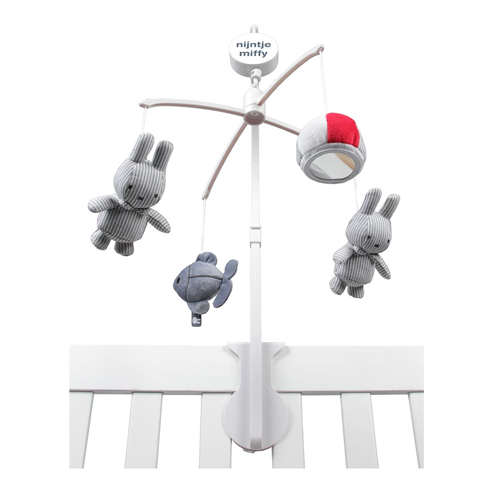 Das Musik-Mobile von miffy ist einfach am Laufstall zu befestigen. Am Mobile hängen vier Spielzeuge: zwei niedliche miffy Figuren, ein Spiegel und ein Fisch.